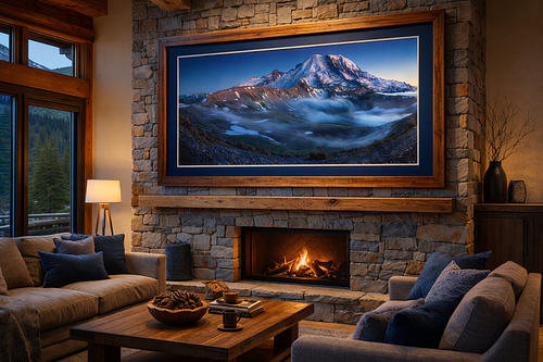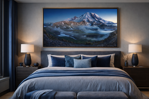 The expansive mountain photograph anchors the room with calm authority, infusing the bedroom with depth, quiet strength, and a refined sense of retreat that elevates the space into a private sanctuary.