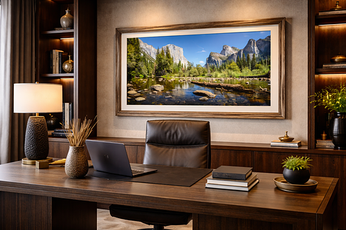 The luminous, museum-finished landscape introduces depth, calm, and refined authority, anchoring the space with natural balance while elevating the office into an environment of quiet confidence, intention, and timeless executive elegance.