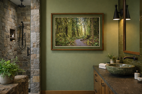 The framed photograph draws the eye immediately. Its wide horizontal format naturally grounds the seating area, giving the wall purpose and balance. The high-gloss print, paired with a crystal-clear acrylic face, adds remarkable depth—light catches the surface subtly, bringing the water, sky, and foliage to life as the day changes. The image doesn’t sit flat on the wall; it feels dimensional, almost immersive.
