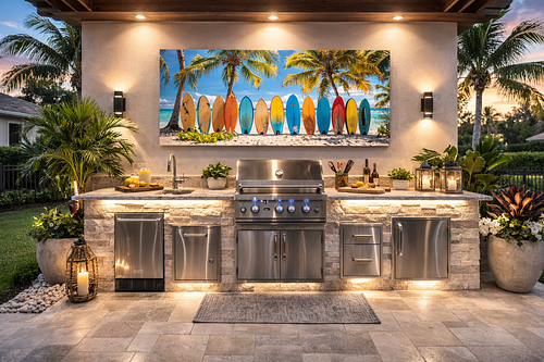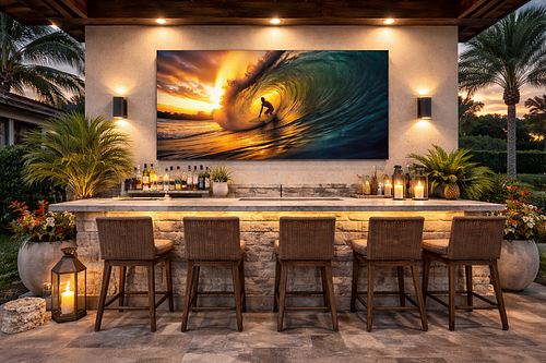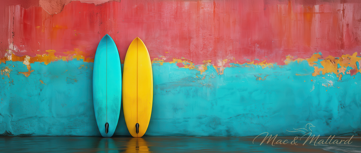 From colorful surfboards standing like old friends beneath tropical palms, to the golden stillness after a sunset session, each image tells a small piece of the surfer’s story. These are the scenes every surfer knows by heart. Hang one of these pieces on your wall and you may hear it too.