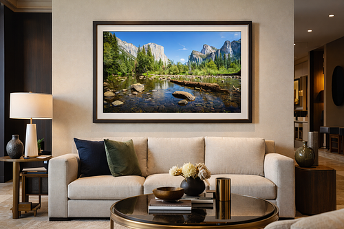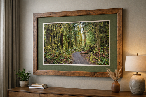 The framed photograph draws the eye immediately. Its wide horizontal format naturally grounds the seating area, giving the wall purpose and balance. The high-gloss print, paired with a crystal-clear acrylic face, adds remarkable depth—light catches the surface subtly, bringing the water, sky, and foliage to life as the day changes. The image doesn’t sit flat on the wall; it feels dimensional, almost immersive.